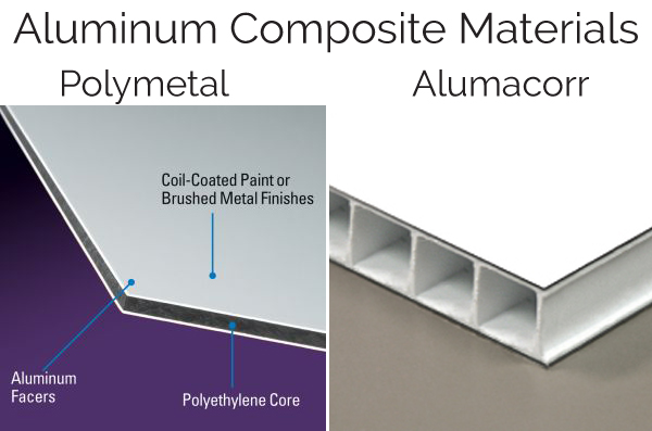 Alumacorr is a the name brand of a product by Nudo Industries. It is a lightweight but very rigid sign material. It is like polymetal, an aluminum composite material (ACM). It is faced by aluminum on both sides with a corrugated plastic core. This type of material is great for outdoor long term use. A common use for this material is for large signs going between two posts in wide open areas such as construction site signs.